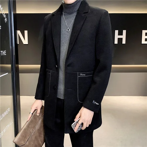 2023 Men's Windbreaker Jacket Autumn and Winter Wool Coat Pure Color Slim Fashion Long Woolen Large Size 4XL