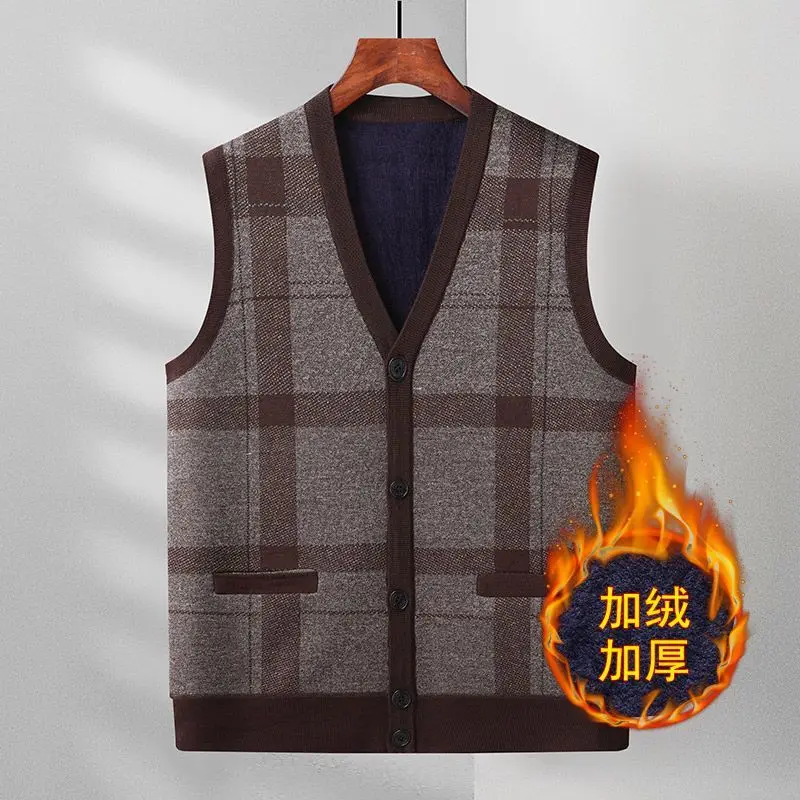 2024 Autumn Winter Men's Fashion V-neck Sleeveless Sweater Coats Male Fleece Warm Knitted Waistcoat Men Plaid Casual Vest D673
