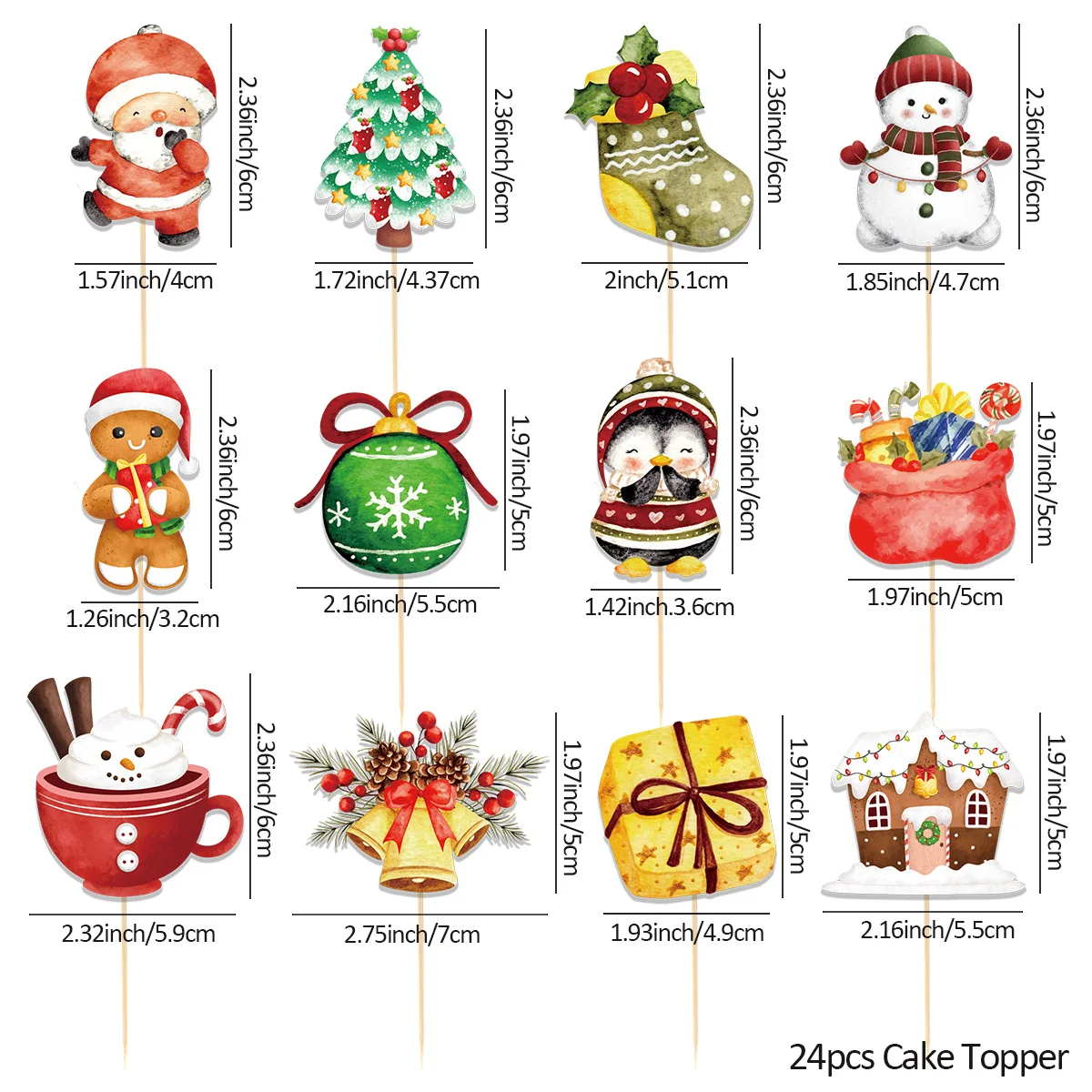 24Pcs Carton Christmas Cake Toppers Santa Claus/Snowman/Penguin Toppers For Merry Xmas Party Cupcake Decorations Supplies Condition: New and positive Pack: 24pcs Note:Due to the adaptation between diversified monitors, the image might not mirror the actual coloration of the object