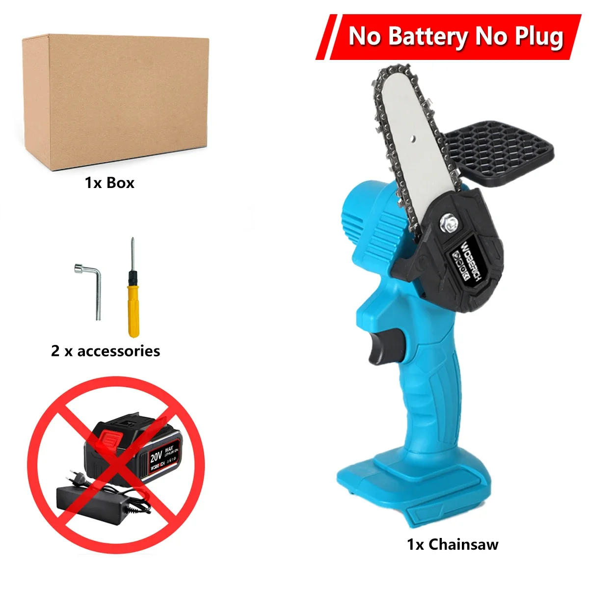 Please note: 1. The options do not include batteries. please prepare the batteries by yourself. 2.In transit, the carton may be slightly broken or the product will have slight scratches, which is normal. Please do not place an order if you mind. 3.If there are any issues with the received product, please contact us as soon as possible, and we can help you solve the problem.Thank you Name:4/6INCH Brushed Electric Chain Saw Color:Blue Materials:ABS+metal Power:550W No-load Speed:3000rpm Guide Plate Length:4inch/6 inch Name:8 inch Brushless chainsaw Power: 1500W Motor: Brushless motor Speed: 45000rpm Cutting Diameter: 30cm Guide Plate: 8 inch Chain Speed: 10m/s Oil Discharge Method: Press To Discharge Oil Features: - The 8-inch chain saw is a brushless motor,Strong power, more output stable than the chain saw modified by the angle grinder. High load so that can not easy to burn(). - Sharp & Strong Chain:High quality alloy chain, wear-resistant and durable, fast and smooth sawing without jamming. - Wide Application:This electric chainsaw has a wide range of uses, can be used for Forest cutting, cutting wood, pruning branches and so on. - Portable Design:Soft rubber handle, anti-skid and sweat-absorbing; Widen baffle design, to prevent wood chips from splashing during cutting;Heat dissipation hole design, efficient ventilation and heat dissipation. Package Included A.4/6 inch No battery: 1 x 4 /6 Inch Electric Chain Saw 1 x Screwdriver 1 x Wrench B.4/6 inch 1 battery: 1 x 4 /6 Inch Electric Chain Saw 1 x Battery 1 x Charger 1 x Screwdriver 1 x Wrench C.4/6 inch 2 battery: 1 x 4 /6 Inch Electric Chain Saw 2 x Battery 1 x Charger 1 x Screwdriver 1 x Wrench D.8 inch No battery: 1 x 8 Inch Electric Chain Saw 1 x Screwdriver 1 x Wrench 1 x Toolcase E.8 inch 1 battery: 1 x 8 Inch Electric Chain Saw 1 x Battery 1 x Charger 1 x Screwdriver 1 x Wrench 1 x Toolcase F.8 inch 2 battery: 1 x8 Inch Electric Chain Saw 2 x Battery 1 x Charger 1 x Screwdriver 1 x Wrench 1 x Toolcase