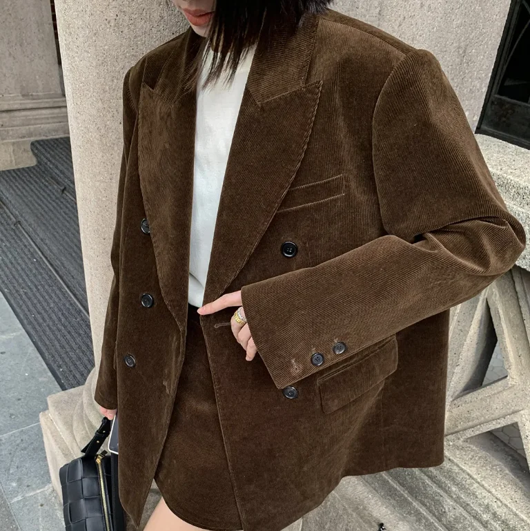 Autumn Winter Women's Velvet Suit Coat Double-Breasted Deep Brown Loose Silhouette Western Style Outerwear