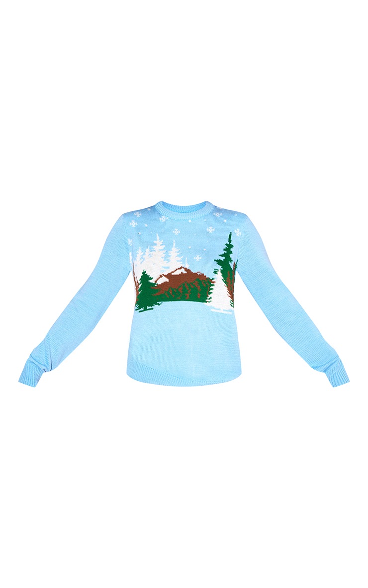 We are loving this sweater for the festive season. Featuring a baby blue material with a landscape jacquard design and long sleeves. Style with cream hue bottoms and heels to steal the look we are loving. Length approx 63.5cm/25 (Based on a sample size S) Model wears size S Model Height - 5ft 9" Model Height - 5ft 9"