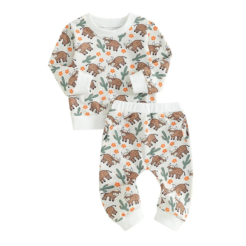Baby Pants Set Cow Flower Cactus Print Long Sleeve Crew Neck Sweatshirt with Sweatpants 2-piece Outfit