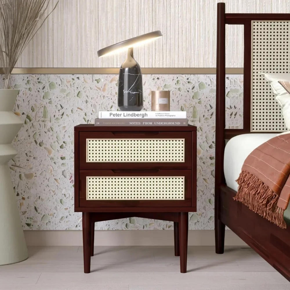 Bed Table 2-Drawer Bedside Tables Oliver Solid Wood Rattan Nightstand/Side End Table Fully Assembled Furniture Sofa Bedroom Home