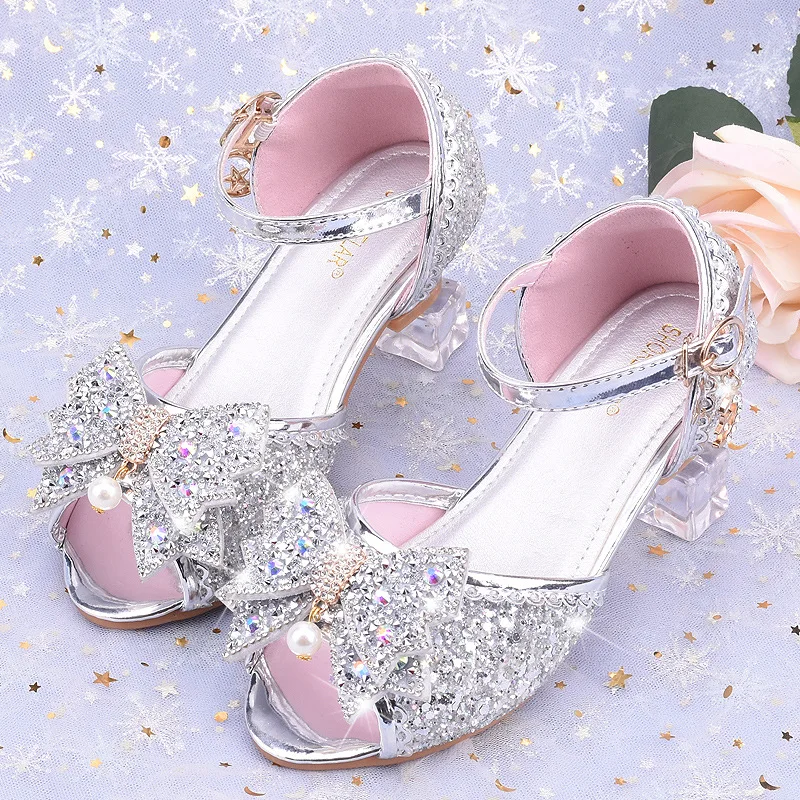 Children Princess Sandals Kids Girls Wedding Shoes High Heels Dress Shoes Bowtie Purple Pink Blue Silver Shoes For Girls