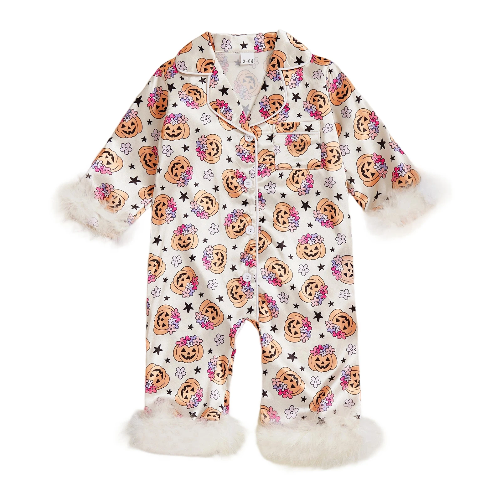 Citgeett Autumn Halloween Infant Baby Girls Pajamas Feather Pumpkin Print Button Long Sleeves Jumpsuit Sleepwear Clothes
