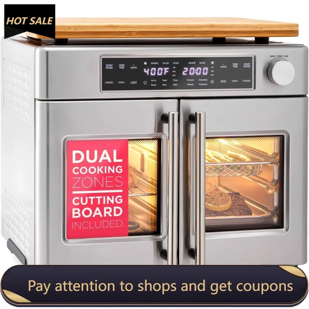 About this item DUAL ZONE MULTIFUNCTION AIR FRYER | 30L Stainless Steel French Door Air Fryer, Rotisserie & Toaster Oven Combines 10 Essential Kitchen Appliances Into One Conveniently Compact Cooker with Unique Single or Dual Zone Capability | All-in-One Set Includes All the Baskets, Racks, Tools & Other Accessories Needed to Prepare Healthy, Delicious Meals in Record Time CHOICE OF 10 DIFFERENT COOK MODES | 10-in-1 Design Offers Maximum Versatility Whether You're Craving a Complete Roast Chicken Dinner or Quick After-School Snack! Preset Cook Functions Include Air Fry, Rotisserie, Pizza, Dehydrate, Roast, Broil, Bake, Reheat & Ferment with Easy Button & Dial Controls for Time, Temperature, Convection, Start/Pause, Sync & Light PERFECTLY SYNCED ENTREES, SIDES & SNACKS | Use Single Zone to Cook Roast Meats, Homemade Pizza & Other Large Batches of Food, or Insert the Divider & Switch to Dual Zone Mode to Prepare Multiple Dishes with Separate Time, Temperature & Function Settings | Handy 'Sync' Feature Ensures Both Chambers Cook to Perfection & Finish on the Same Time! EASY-CLEAN BASKETS, RACKS & ACCESSORIES | Interchangeable Trays & Tools Optimize Your Multi-Zone Cooking Experience, While Our Durable Parts Wash Easily for Stress-Free Cleanup | Includes Small & Large Fry Baskets, Wire Racks & Baking Pans, Dual-Zone Divider Wall, Removable Crumb Tray, Oven Liners, Cutting Board & Rotisserie Set with Fetch Tool GREAT GIFT FOR HOME CHEFS & BIG FAMILIES | Feed a Crowd & Bring Home an Attractive Appliance That's Simple & Comfortable to Operate in Any Kitchen! 30L-Capacity Oven Handles Huge Servings of French Fries, Chicken Tenders, Onion Rings, Veggies & Beyond with Large Double Door Access, Easy-Grip Handles, Built-In Viewing Windows & Internal Light