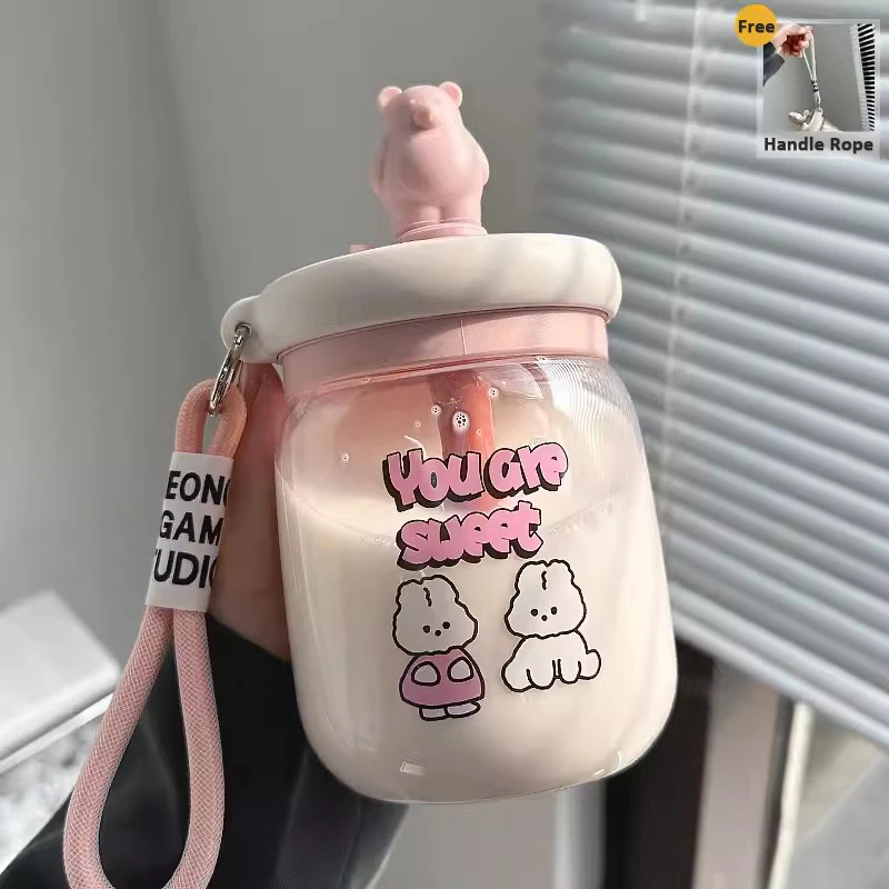 Kawaii Jumbo Boba Water Bottle With Straw For Girls Kids Large Capacity Cute Stirring Cup Portable Dual Drinking Plastic Cups