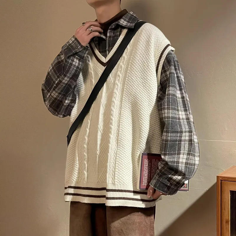 Men Sweater Vests Thickening Autumn Winter V-neck Sleeveless Knitted Tops Warm Ins Loose Striped Casual Male Baggy Korean Style