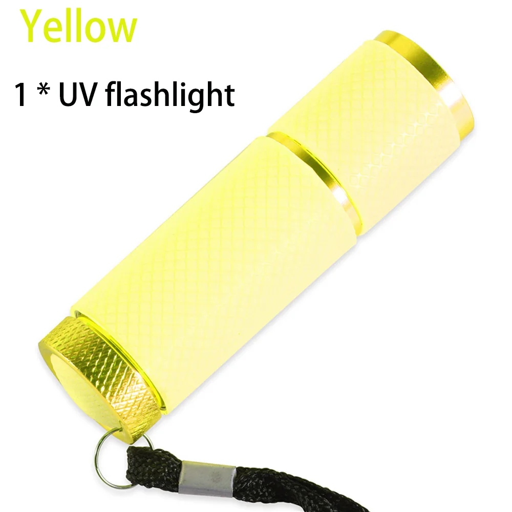 Mini LED UV Flashlight Ultraviolet Torch 395nm UV LED Lamp Nail Dryer for Gel Nails Blacklight Portability Nail Dryer Light lamp Features (1)UV gentle make the uv gel nails hard to interrupt and wholesome to the body.(2)With the black strap, its handy to carry.(3)Short hardening time. An steady flashlight lamp beads arrived nine lamp beads.(4)9 LEDs, low strength consumption, ultra-bright, seen over a long distance.(5)Light weight, compact and straightforward to carry.(6)Can be used for surroundings nail polish and assorted type of UV products, similar to UV Top Coat / UV Builder Gel / etc.(7)Can be used for either arms and feet. Use of tricks A. coating a layer kiss mixtureB. gentle with LED nail Lamp for 2 minutesC colour nail oil glue, gentle for two minutesD times, Coating shade nail oil glue, soft in two minutesE. coating glue to seal, comfortable for 3 minutes, total Specifications Light bulb: 9 LEDOperating voltage: 4: 3x 1 AAAColors: Blue, Pink, Yellow, Green