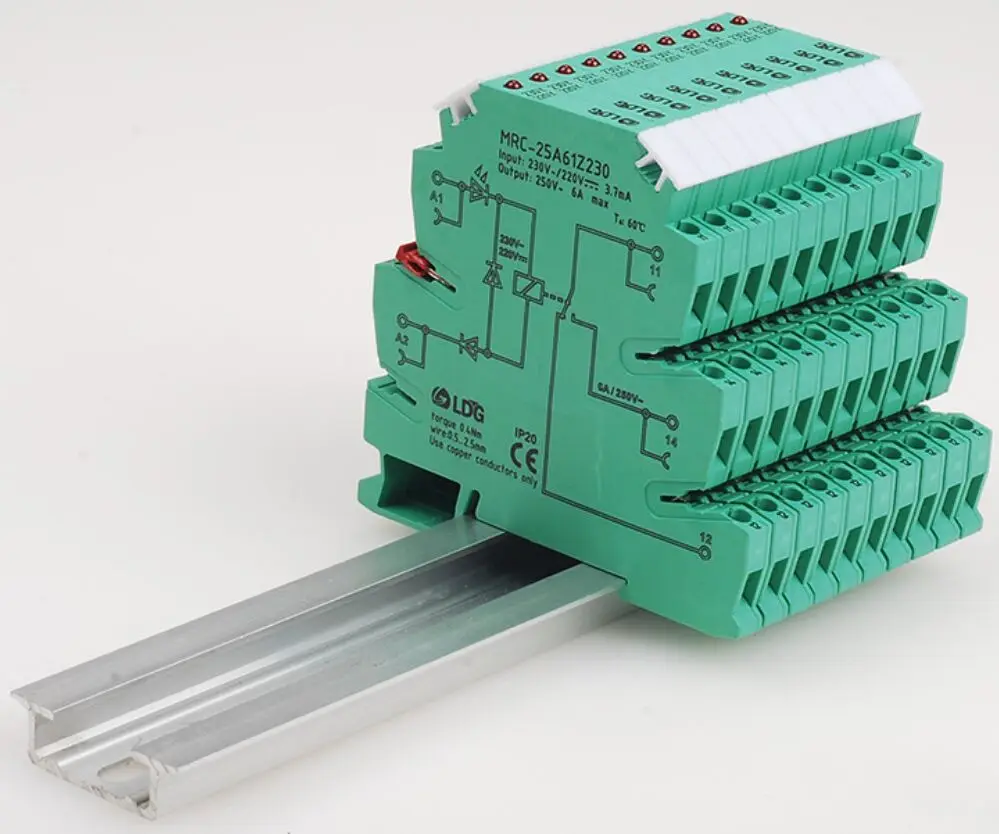 Electromagnetic Contact -Interface Relay MRC-25A61Z230 Product Features Red LED indication,clear port park The width is only 6,, which saves 60% of installation area Plug-in bridging kind DIN rail set up Multi-standard voltage enter sign :5V,12V,24V AgSnO2 Contact ,UL,VDE,CQC,Multinational-authorized rela Integrated design;good anti-seismic and impact resistance ability;inner input polarity protection circuit Product Specification: Manufacturer Part Number MRC-25A61Z230 Item Weight 50g Product Dimensions 81x6 Output Voltage Range 5-250VDC/AC Input Voltage: 230VAC/220VDC Max Current 6A Input Current three Input loop Red LED;Bridge-type rectificador Pull-in time:≤8/4ms Contact Material: AgSnO2 Input/output Isolation Voltage:4kV(50Hz,1min) Ambient Temperature:-20℃ -60℃ Operative Standard:IEC60664,EN50178,IEC62103 Appliacable wire:(Ridigity)0,(Flexibity)0,(AWG)24-14