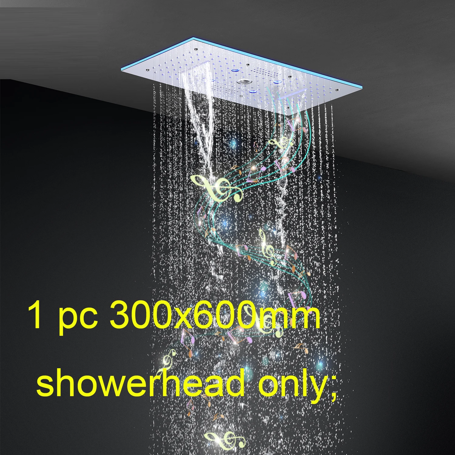 Specifications:Procuct size: 600X300 mmFunction: rainfall/ waterfall/ misty/ column Finish: reflect finishedShower head material: 304 stainless-steel chromemixer material: brass chromehand shower: plasticslide bar, spout: brass chromeThread: G1/2&;&;+ G3/4&;&; Installation:ceiling embeded kit includes:1* 304SUS Led bathe head1 * bathe mixer1 * hand bathe ,slide bar , hose , spout1 * led distant controller without battery
