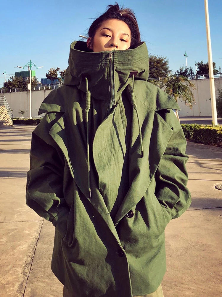 Nerazzurri Spring Autumn Oversized Armygreen Black Zip Up Trench Coat for Women with Hood Long Sleeve Loose Fashion Windbreaker