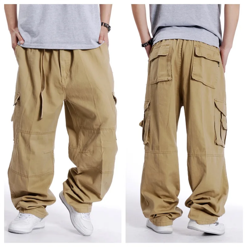 New Men's Multi Pocket Pants Casual Fat Cotton Work Pants with Plus Size Wide Legs, Elastic Waist, Loose Long Pants