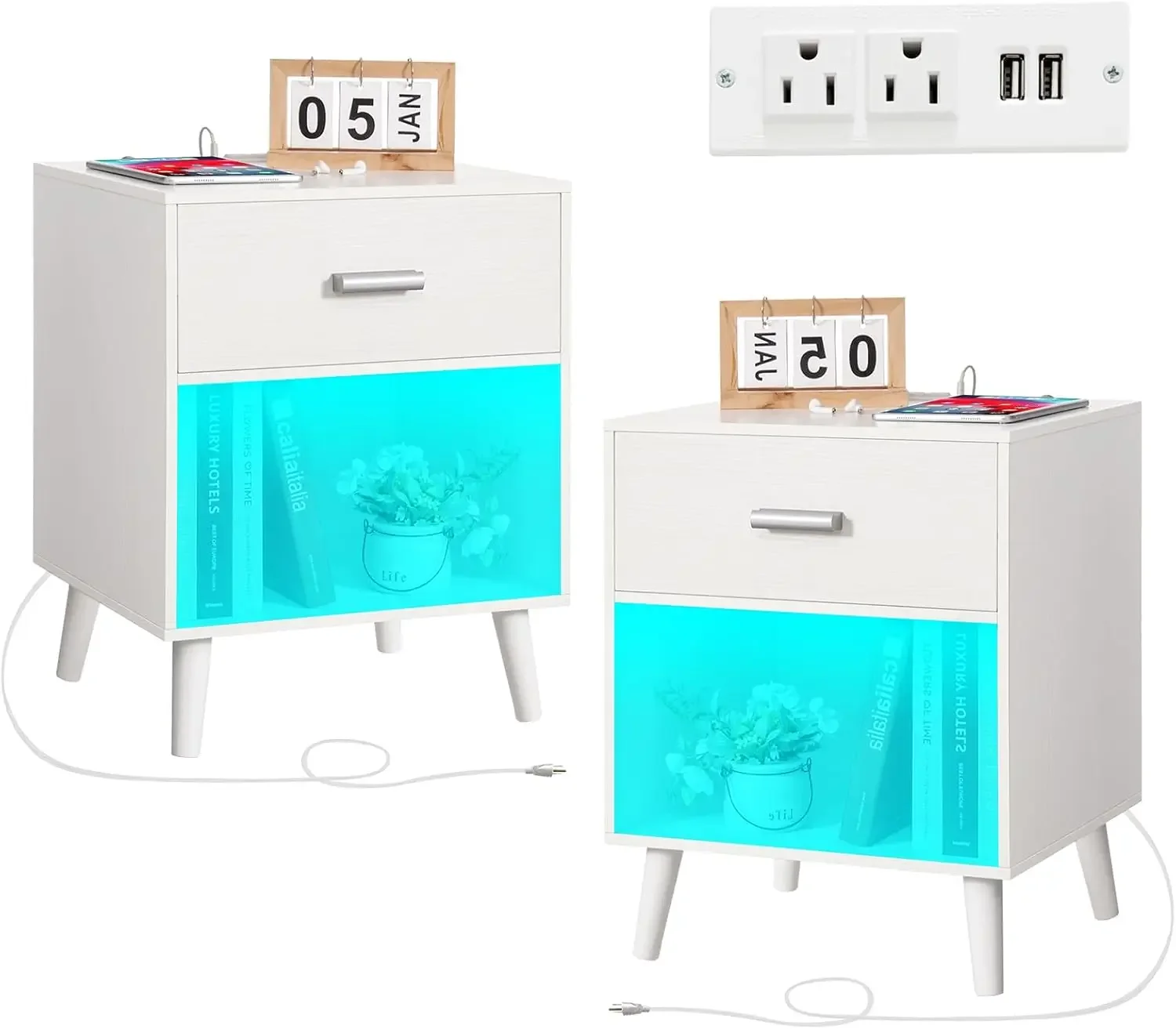 Nightstands Set of 2, Nightstand with Charging Station & LED Light, Night Stands with Drawer for Bedroom
