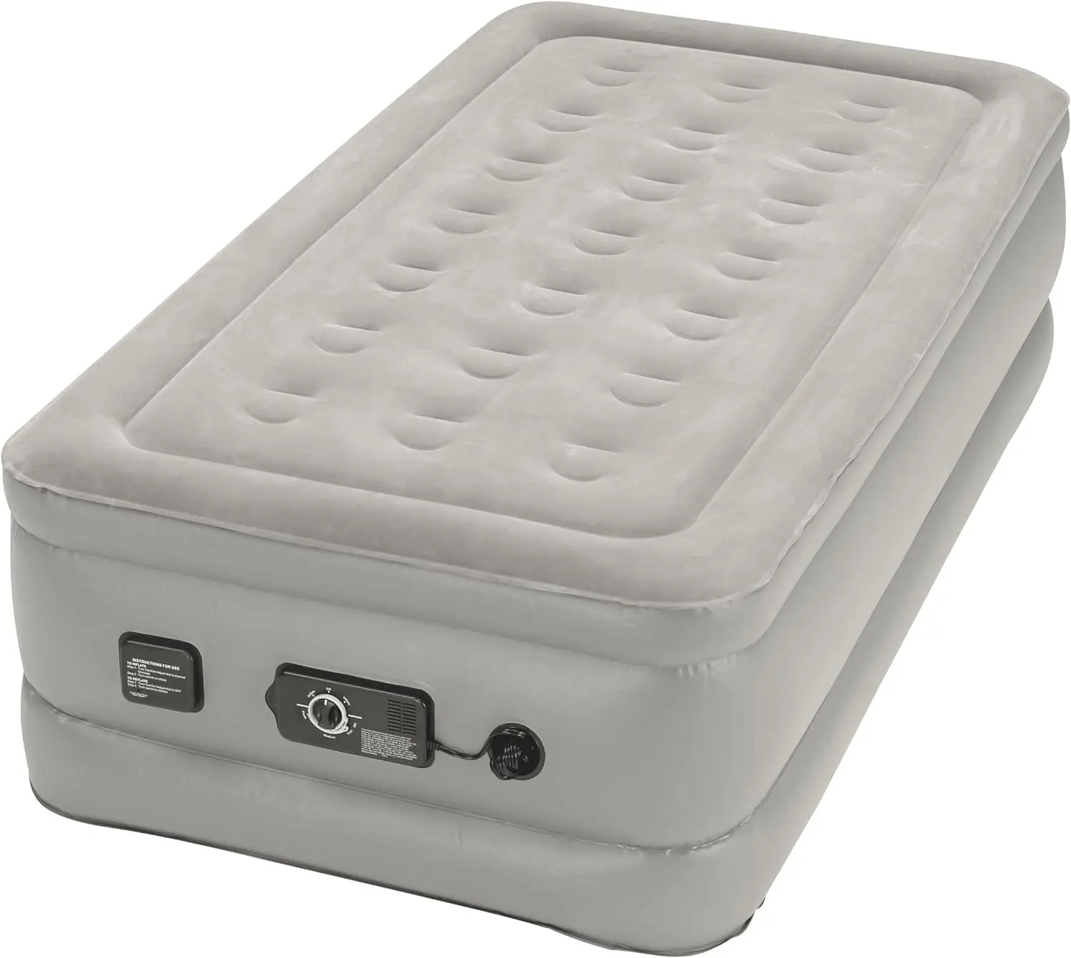 Product Description Integrated NeverFlat pump technology: select desired comfort level, engage primary pump, and it shuts-off automatically at your chosen setting. Senors continuously monitor air pressure throughout the night, and a silent secondary pump engages automatically to maintain consistent firmness and comfort. NEVER FLAT TECHNOLOGY: Our twin air mattress has 2 inflation pumps. One handles rapid inflation and deflation at the turn of a dial. The secondary silent air pump will allow you to set your desired firmness of the inflatable bed, and then if the bed looses air during the night the silent secondary pump will automatically turn on and retain your desired firmness. PREMIUM CONSTRUCTION: Constructed with heavy duty waterproof puncture resistant materials. This Air bed sits tall like a traditional bed, futon, or sofa bed. At 18" tall any guest should be able to get in and out of this guest bed with ease. This portable twin air mattress with built in pump is a premium sleep solution for anyone looking for the best nights sleep possible. SOFT AND SUPPORTIVE: This luxury twin air mattress uses independent coils to allow for a firm yet supportive sleeping experience. This premium twin inflatable bed houses 21 coils. The flocking on the surface of this blow up bed creates a plush and breathable membrane that is comfortable to the touch or secures your sheets all night long. READY TO GO: The Never Flat Raised twin air mattress is ready for anything whether your are camping out, sleeping over, or hosting a house full. This blowup bed packs down small for storage and transportation. The included storage tote bag is oversized so packing up the air mattress is easy. The airbed also comes with a built in cord storage box. This makes your self inflating air mattress the best portable bed you could ask for.