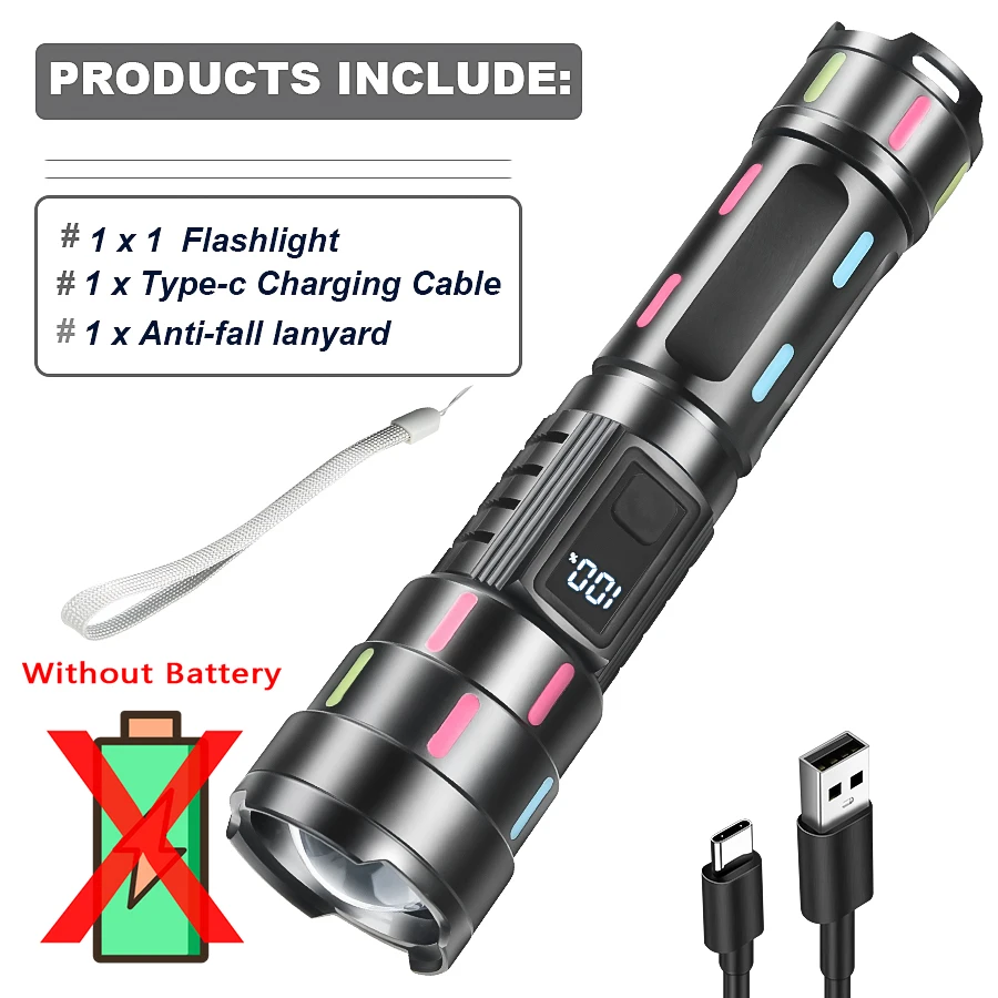 Super Bright Spotlight Long Range Flashlight Tactical Zoomable Emergency Torch USB C Charging 72H Endurance with Power Indicator