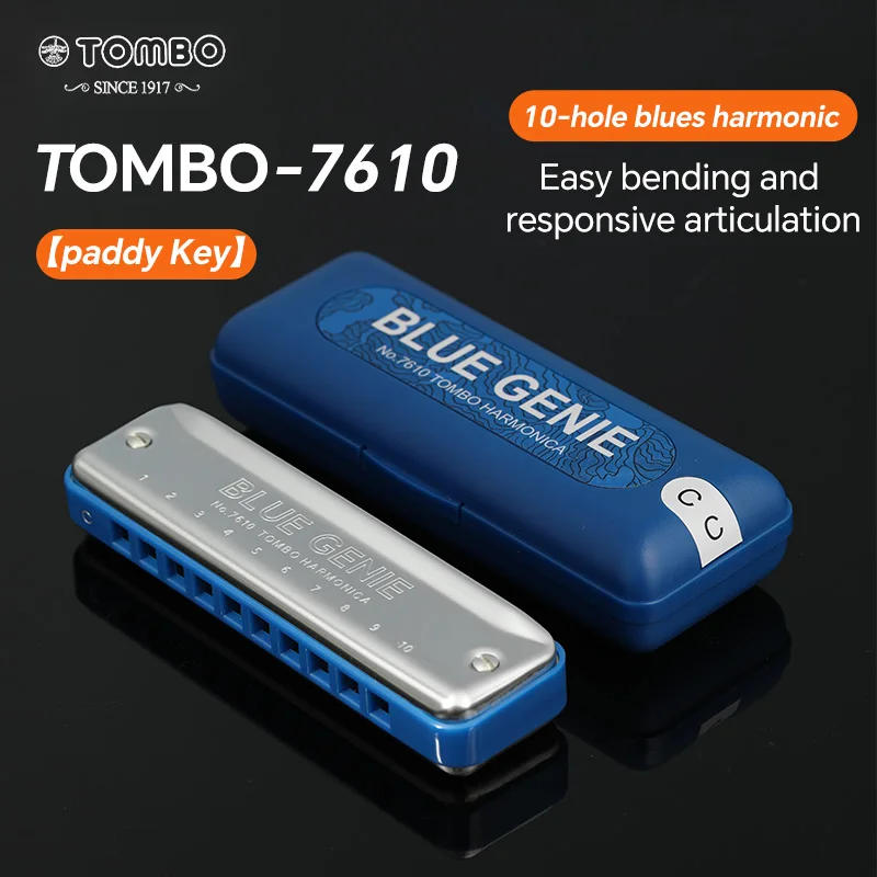 TOMBO 7610 Paddy 10 Hole Blues Harp Harmonica Diatonic Mouth Oragn Key of C with Grey Plastic Comb for Beginners, Adults