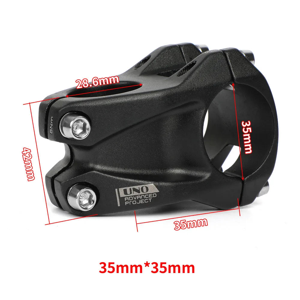 UNO MTB Mountain Bike Stem 35mm Clamp 0 Degree Bicycle Stem 35/45mm Short Bar Riser High-Strength Handlebar Extender Brand:UNOName:High Strength Aluminum Alloy MTB Bike Stem Length: 35mm / 45mm Fork Steerer: 28 Handlebar diameter: 35mm Stem Riser: 0 degree Install height:42mm Material: 6061 T6 Aluminum Alloy Color: Matte black Weight: Around 191g (45mm) Package Includes: 1 x Bicycle Stem