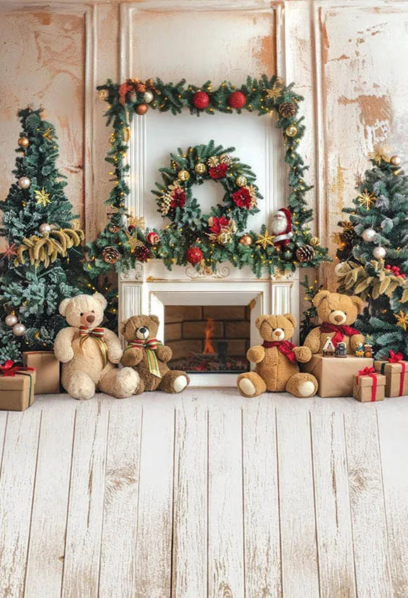 Vertical Christmas Photography Background Indoor Fireplace Fire Christmas Tree Candle Gifts Bell Wreath Decoration Photo Studio