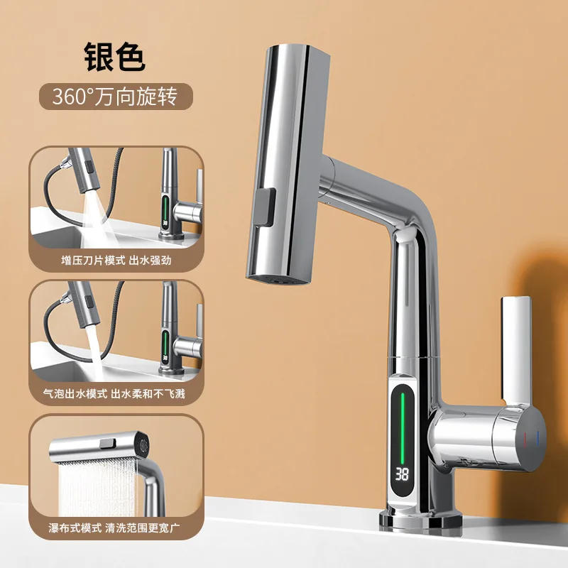 Waterfall Basin Faucet Pull-Out Kitchen & Bathroom Faucet Rainfall Temperature Digital Display No Battery SUS604 Stainless Steel