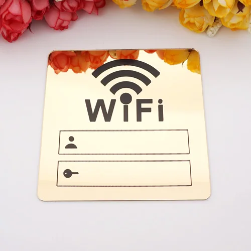 WIFI Sign 3-D Acrylic Mirror Wall Stickers Rewritable Handwriting Account and Password For Public Shop WIFI Signage Material : acrylic mirror surface sticker,With self-adhesive glue at the back :Gold ,Silver,BlackSize :4 inch (10cm *10cm) you want a more massive length ,you click on this hyperlink : item isn't for tradition should write the account and the password on your own you get this text ,you can take a use water-based pens, oily pens, marker pens, signaturepens to write down the account and the password on the replicate face
