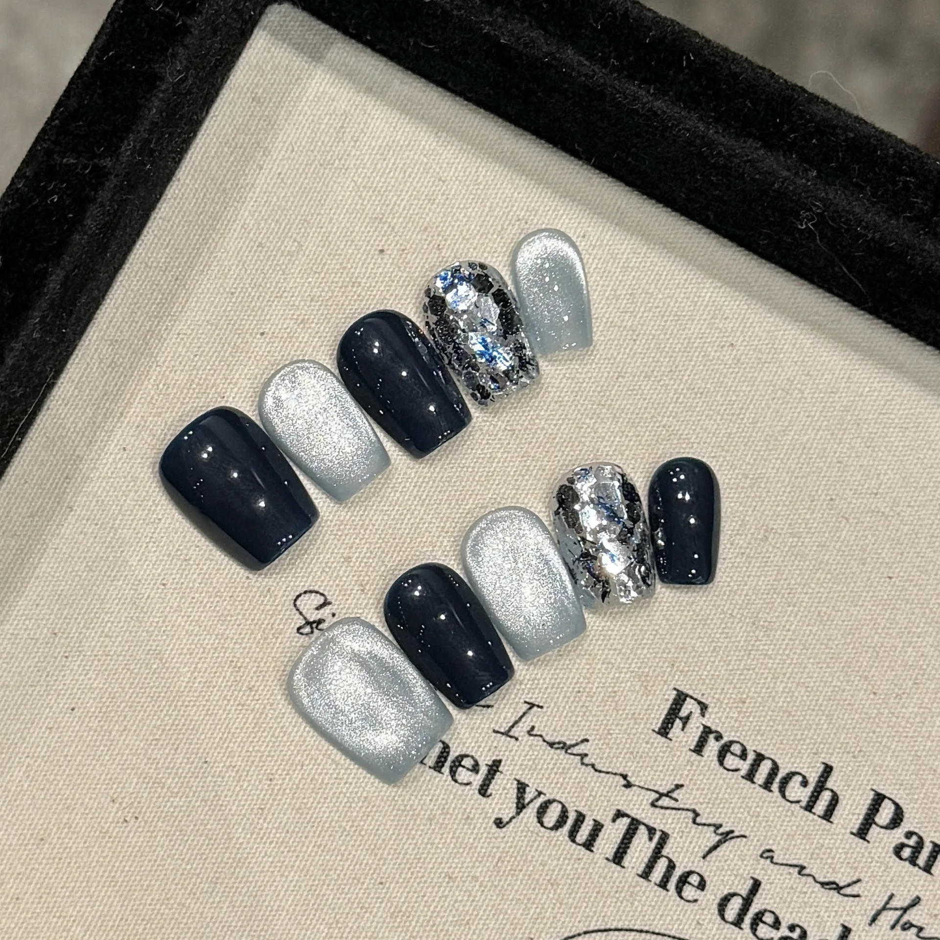 10Pcs Handmade Press on Nails Full Cover Blue Cat Eye Planet Short Ballerina Glitter False Nails Wearable Manicure Nail Tips Art