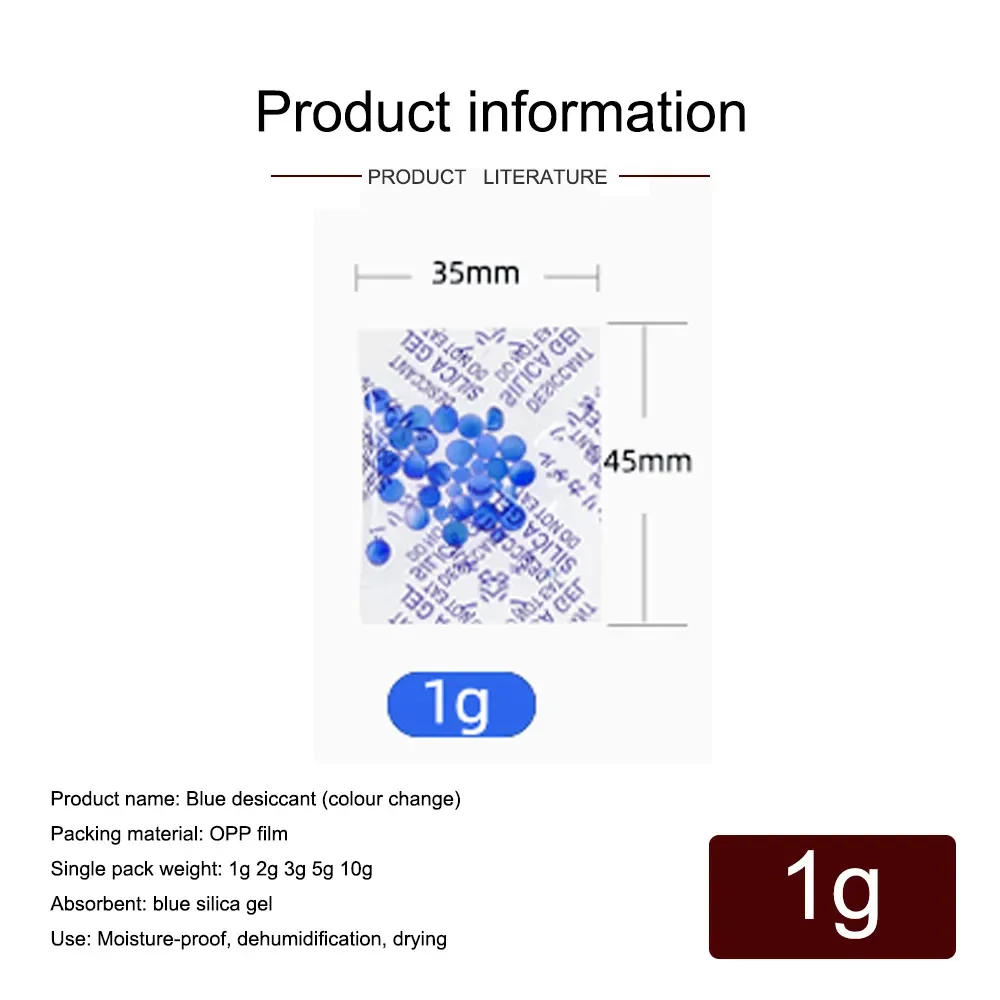 ew Product Big Discount100% fresh and fantastic Prevents tarnishing of gold and silver Prevents your worthwhile equipment from rusting Protects against costly leather goods corresponding to electronics, shoes, boots and many others Protects against worthwhile digital camera equipment, picture albums and laptop media storage and so on Material OPP film blue coloration changing silicone Size: 1/3/5/10g Colour: clean blue Quantity 10/20/50/100pcs Features: Reusable Note: Colour changing silica gel, will exchange colour when smelling moisture, brief remark of moisture absorption, when the blue indicator debris flip pink, prompt to switch the desiccant Due to the variation of different monitors, the picture may not mirror the particular color of the article Thank you! Packaging included: per your desire x 1 Shipping All goods can be shipped by way of Airmail publish within three enterprise day delivery takes roughly 10-35 business days If you've bidded many goods from us in a time , we are able to combine your shipping and give you a small discount If the product you've got obtained are damaged, please take a photograph of it and send to our e mail If the product is really damaged, a full refund or a brand new substitute is okay But the replacement desires you to bid one other item from us ,then we can ship them to you together Otherwise,you need to pay for the transport of this substitute Feedback All the positive feedbacks are appreciated If you're satisfied with our service and products, please go away us a favorable suggestions And we will do an identical to you If you've any problem, please touch us first instead of go away detrimental suggestions Just a negative or impartial suggestions won't remedy the difficulty Please believe us that we are able to solve the difficulty with a satisfational methods Any question you have ,please touch us Enjoy your shopping