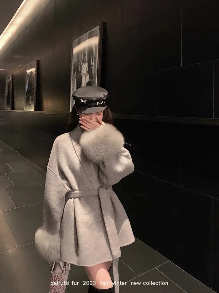 2023 New High End Double-sided Wool Strapping Coat Women Removable Cuffs Fox Fur Temperament Double-sided Cashmere Short Jacket
