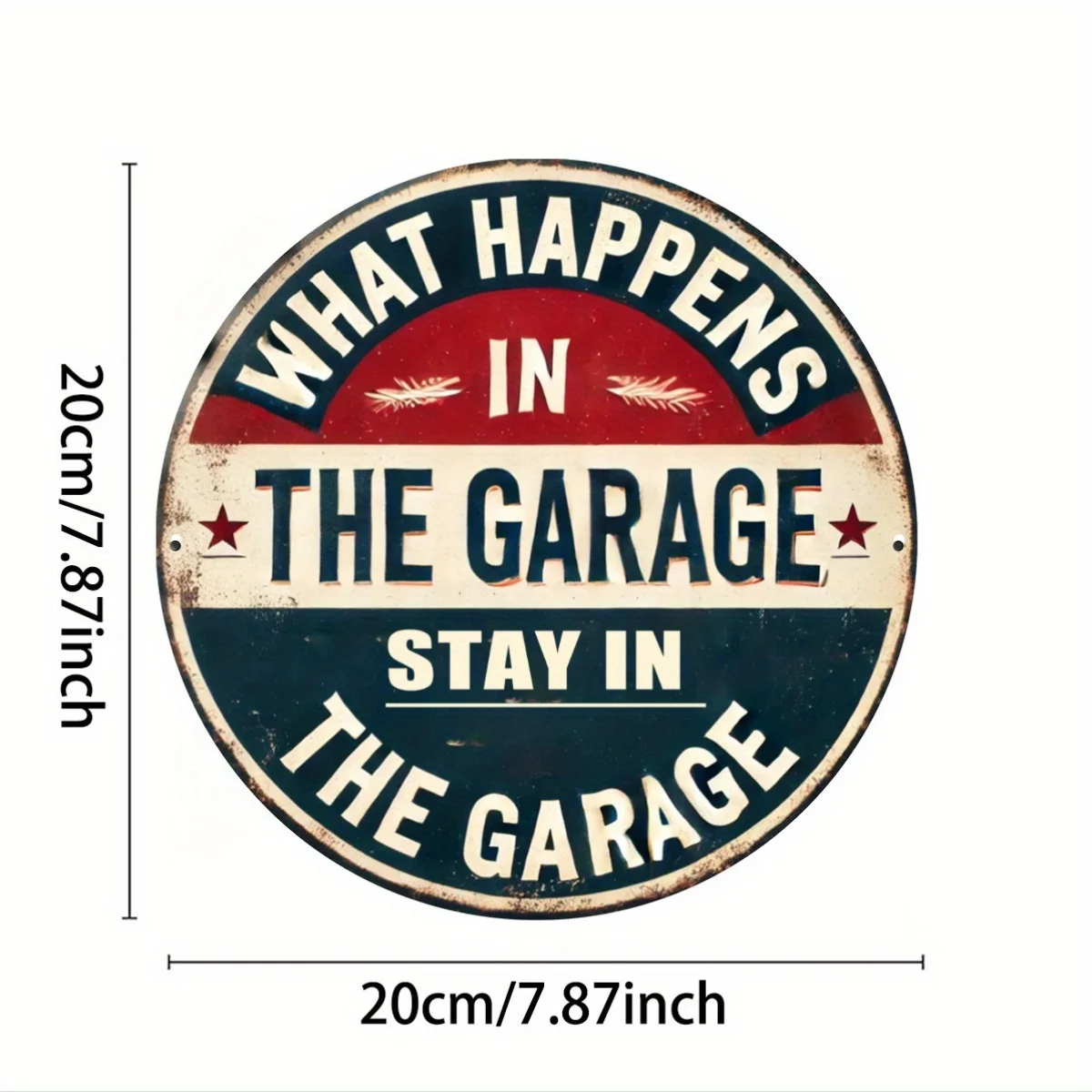 2D Vintage-Style Round Aluminum Sign "What Happens in The Garage" - 8X8 Inches, Suitable for Outdoor Decor, Yards, Porches