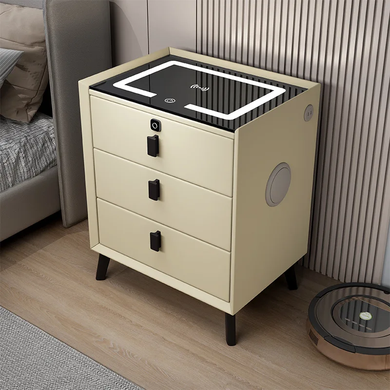 three Drawers Smart Bedside Table ITEM: bedside desk MATERIAL: stable wood+microfiber leather+tempering glass SIZE: 50*40*60cm (for different size, please touch us first) COLOR: can be personalized FUNCTION: V1: LED+USB+wireless charging V2: LED+USB+wireless charging+Bluetooth speaker V3: LED+USB+wireless charging+Bluetooth speaker+fingerprints lock
