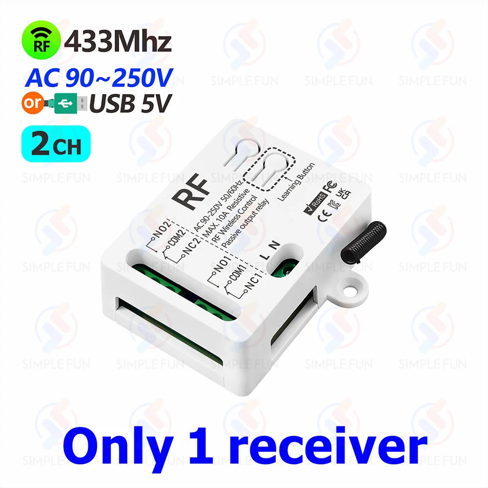 Note: Hello, in order to meet the needs of different customers, we have establish a number of purchase ideas Please eavesdrop on verify the order to circumvent procuring a unmarried remote control or receiver Thank you 433MHz Wireless Remote Control Light Switch 2 CH,AC 110V 220V RF Relay,500m Control Distance,for Lamp/Motor/Garage Door Opener ▶Relay Receiver Board Parameter Working voltage : AC 90V~250V or USB Type-C 5V-0 Input vlotage : 1~250V Output vlotage : 1~250V Quiescent Current : <5MA Max current : 10A Max load: 2200W RF frequency : 433MHz Pin : NO / COM / NC Working temperature : -30~+80 Celsius Receiving Sensitivity : >97dbm Amount of garage remote controls : 15 pieces Support encoding : 1527 Learning code /2262 fixed code RF Operating mode : ASK superheterodyne wireless reception Receiving range : Open area is more than 500 meters Remote working mode : Momentary Mode/ Toggle Mode/Latched Mode/Mix Mode/Motor Toggle Mode NC:Normally closed pin COM:Common pin NO:Normally open pin ▶Remote controllerParameter RF frequency : 433MHz Control Distance : 500 meters in open area Material : Plastic Support encoding : 1527 Leaning code Battery : 23A 12V included Size:90*40*14 mm ▶Supports 5 operating modes and has a completely big selection of purposes Momentary Mode / Toggle Mode / Latched Mode / Mix Mode / Motor Toggle Mode ●Remote control table lamps\AC or DC LED lights\bulbs\electric curtains\water pumps\fans\ventilation devices\signal transmission ●Remote management garage door\electric door\house door\rolling door\telescopic door\gate\barrier gate ●Remote control motor forward and reverse\motor switch\DIY ▶Examples of utility scenarios: for handheld remote control lights/fan for distant managed motors/garage door opener ▶500 meters control distance: The signal is secure and can go through walls, and the pairing is flexible The handheld remote control distance can attain 500 meters (in an open area) The handheld remote control A button controls channel 1, and the B button controls channel 2 One receiver could be paired with as much as 15 distant controls ▶Wiring diagram Various wiring methods, listed below are four examples you've got any questions, please contact us, we are able to attempt our greatest to answer, thanks ▶Operation Mode ●Momentary Mode: 1 Press and maintain the button"A", relay "1" will flip on; 2 Release the button"A", this relay "1" will turn off In an identical way, the button"B" can control relay"2" Set up: Click learning button on the receiver 1 time,click the button"A" 1 time,click the button"B" 1 time,succeed ●Toggle Mode: 1 Press the button"A", relay "1" will flip on; 2 Press the button"A" again, this relay "1" will turn off In the same way, the button"B" can control relay"2" Set up: Click learning button at the receiver 2 times,click the button"A" 1 time,click the button"B" 1 time,succeed ●Latched mode(This mode calls for a remote control with a minimum of 3 buttons or more): 1 "A" key, relay "1" will flip on; 2 "B" key, relay "2" will turn on, on the same time relay "1" will turn off three "C" key, Both relays "1" and "2" will flip off Set up: Click learning button at the receiver three times,click the button"A" 1 time,click the button"B" 1 time,succeed ●Mix Mode: 1 and maintain the button"A", relay "1" will flip on; Release the button"A", this relay "1" will turn off 1 the button"B", relay "2" will turn on;Press the button"B" again, this relay "2" will turn off Set up: Click learning button at the receiver four time,click the button"A" 1 time,click the button"B" 1 time,succeed ●Motor Toggle Mode: 1 the button"A", relay "1" will flip on, Press the button"B", relay "2" will flip on, at the same time relay "1" will turn off Press the button"B" again, relay "2" will flip off 1 the button"B", relay "2" will turn on, Press the button"A", relay "1" will flip on, at the similar time relay "2" will flip off Press the button"A" again, relay "1" will flip off Set up: Click learning button at the receiver 5 time,click the button"A" 1 time,click the button"B" 1 time,succeed Reset 1 learning button eight times to scrub data,then all remotes can not control this receiver Notice: 1 Reset before you desire to exchange the working mode of 1 handheld remote control 2 After reset, all the distant controls can't paintings anymore three Replace the battery in time when the remote control voltage is low To get the stronger sign transmission If you prefer to buy a number of pieces, please contact us and we are able to have further reductions Please contact with us if in case you have any questions you