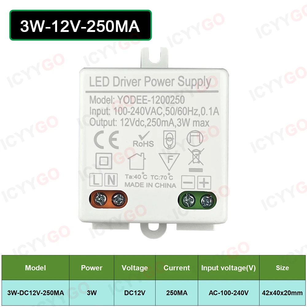 High Quality AC/DC Adapter LED Driver Great for LED lights, LED strips and stage lighting fixtures Specification: 3W-12V-250MA 6W-24V-250MA 6W-12V-500MA 7 10W-12V-830MA 12W-24V-500MA 12W-12V-1 •Power: 6W 7 10W 12W •Input: 100-240V 50/60Hz •Output: DC 12V 24V 250MA 500MA 600MA 830MA • Dimensions: approx forty two x forty two x 20 mm Wiring Method: The input terminal is on the L N position, the output terminal + is at the LED effective line, and - is the LED unfavorable line