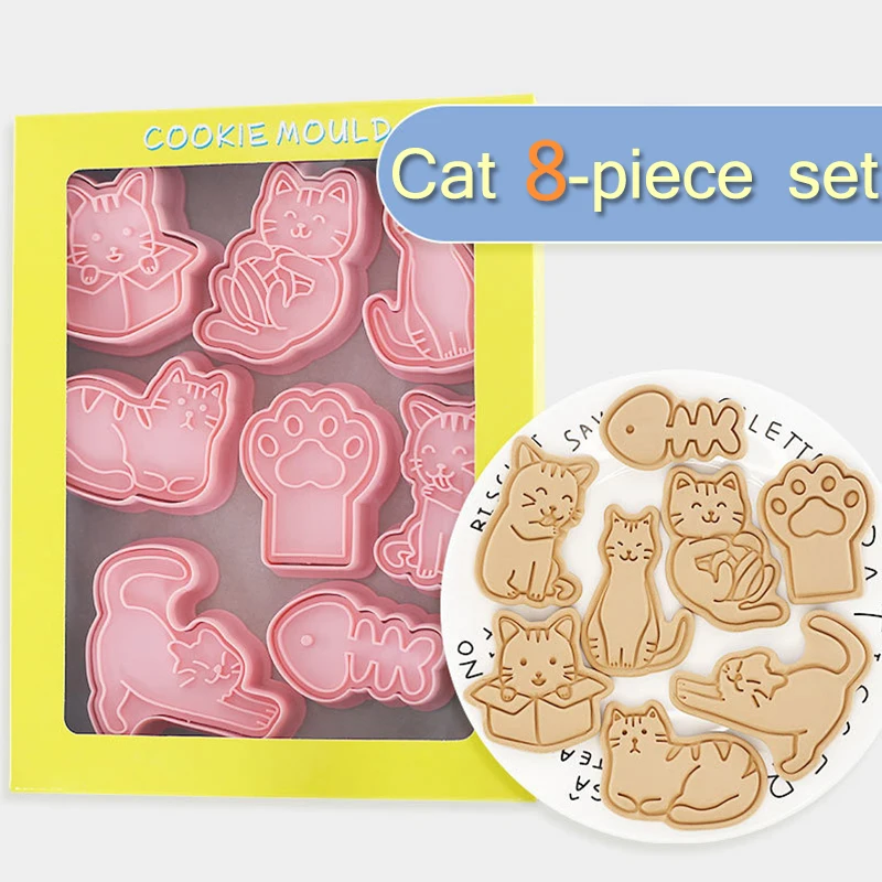 8Pcs Cat Cookie Mold Set Cartoon Cat Claw Fish Bone Shape Cookie Stamp Fondant Cake Decoration Tools 3D Hand Pressure Plastic