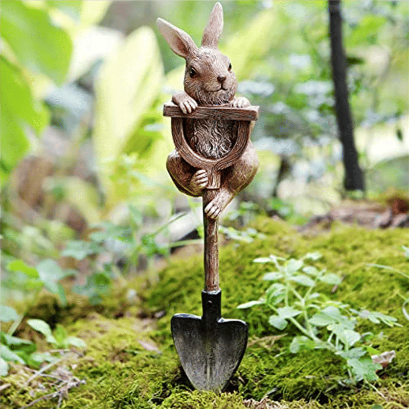 ABGE-2X Bunny Statue Whimsical Garden Decor For Outside, Resin Bunny Figurine On Shovel, Outdoor Lawn Decoration