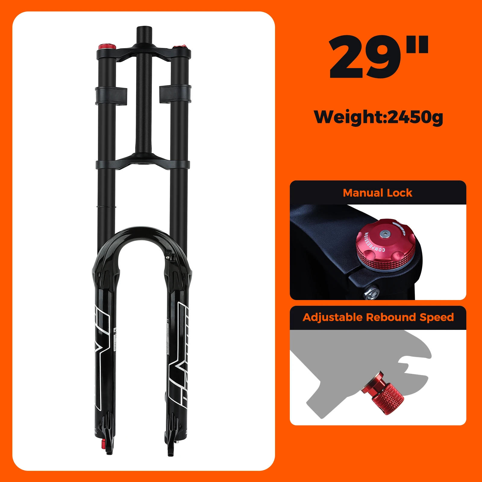 Brand: BOLANYFork Type: Double Crowns Damping Oil and AirTube Diameter: 32mmLockout System: Manual LockoutMovable Travel:150mmColors: BlackWeight: 27:2350g,29:2450gSuitable For Wheel:26"-27"/29"Maximum Tire Width: 2 InchesSteerer Tube Size:Straight Tube 28: Upper Part Aluminum Alloy, Lower Part Magnesium AlloyDamping Adjustment: SupportedBushing: Teflon + SpongeAxle Size: 9x100mm(Quick Release)Maximum Air Pressure Value: About 120PSICompatible with Brake Discs: Default is 160mm, 180mm or 203mm requires the use of an adapter Period: One YearÂ