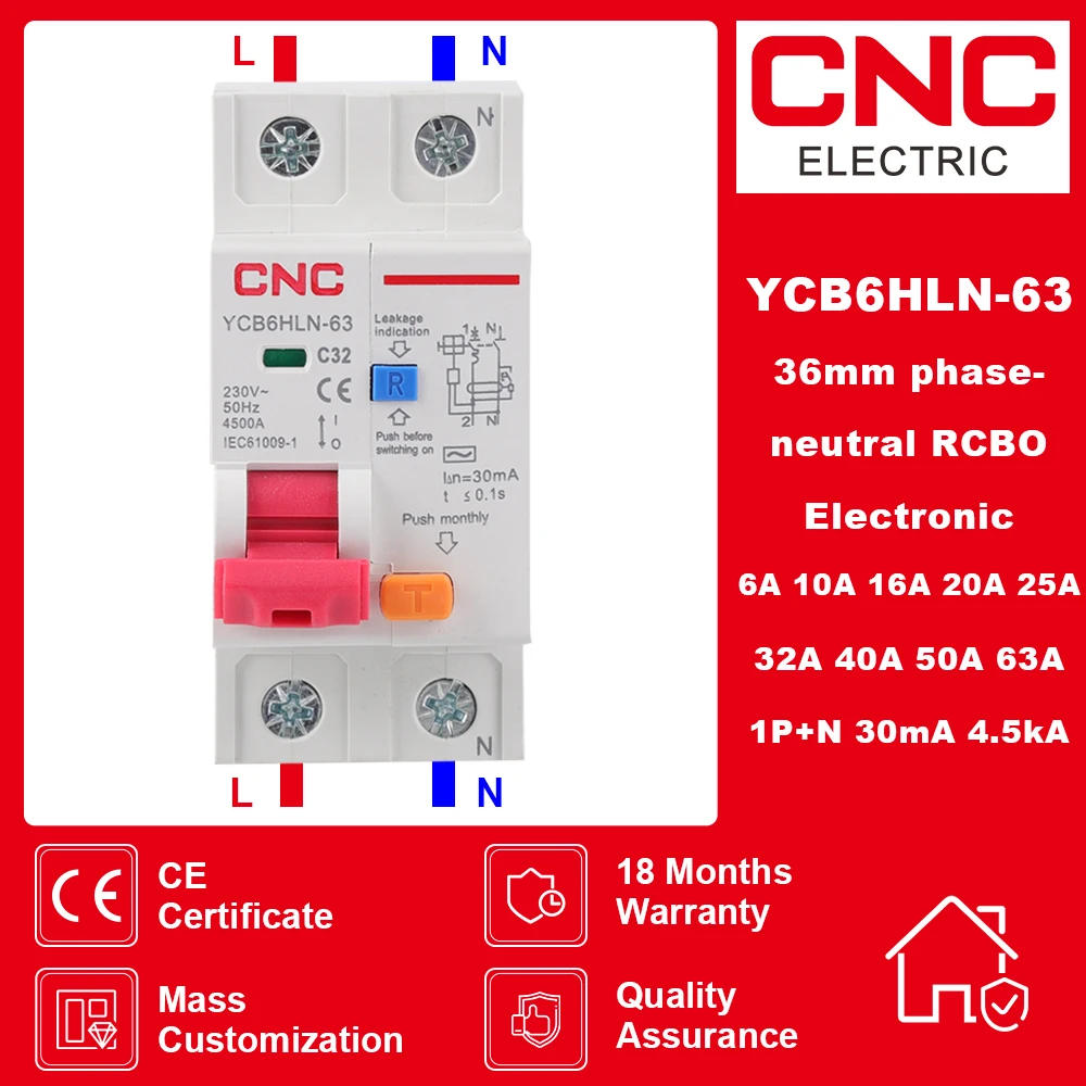 CNC 230V 50/60 HZ RCBO MCB 30mA Residual Current Circuit Breaker With Over Current And Leakage Protection 6/10/16/20/25/32/40 A