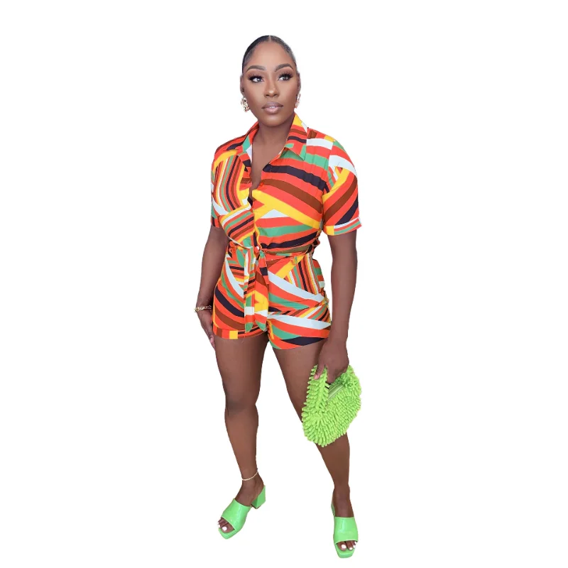 Colorful Stripe Print Two Piece Set Women Short Sleeve Lace Up Crop Shirts Top Elastic High Waist Shorts Summer Casual Suits