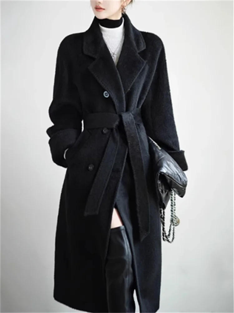 Cotvotee Alpaca Wool Coat Women Autumn Winter 2023 Vintage New Double Breasted New Jacket Casual Turn Down Collar Long Coats