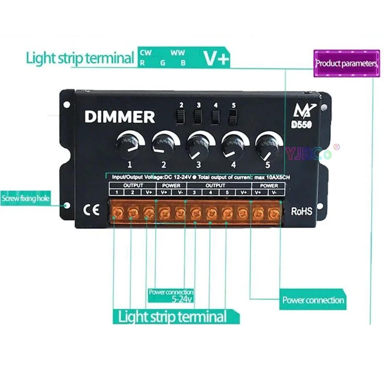 Specifications:Power shipping voltage : DC12-24V Dimming range: 0%-100% Delay time:20NS Connect terminal: screw join mode, terminal caliber 7mm Connect mode: common anode Output power: 12V<600W 24V<1200W Output: 5 loops each 10A Output current: <50A Total Output of current:max 5*10A Net weight: 303g Gross weight: 327 Working temperature: -20-60℃ Dimensions: L168ΧW82ΧH34 mm Packing size: L173ΧW90ΧH40 mm IP degree:IP 20 Non-waterproof Features: The five channels dimmer is a controller for stepless dimming. There are five outputs in total, utilizing the knob control method, which may independently management the brightness of every color, well matched for RGB/RGBW/RGBWW/monochrome(single color) smooth strips notes : Not appropriate for RGB led strip light. Package Includes: 1 * D550 dimmer 1 * User guide ( English )