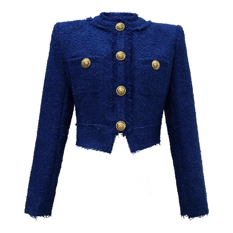 Fashion Short Jacket for Women Elegant White Blue Tweed Tops Coat Long Sleeve Buttons Femme Clothes Office Lady Street Outwear