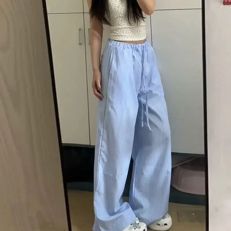 Striped Thin Women Wide Leg Pants Summer High Waist Drawstring Loose Female Casual Pants Korean Fashion Preppy Jogging Trousers