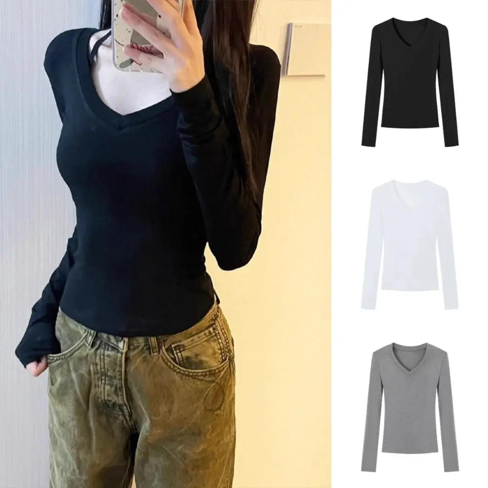 Sweet Y2K Long Sleeved T Shirt All Match Solid Color V Neck T-Shirt Undershirt Simple Basic Tees Tops Spring Autumn