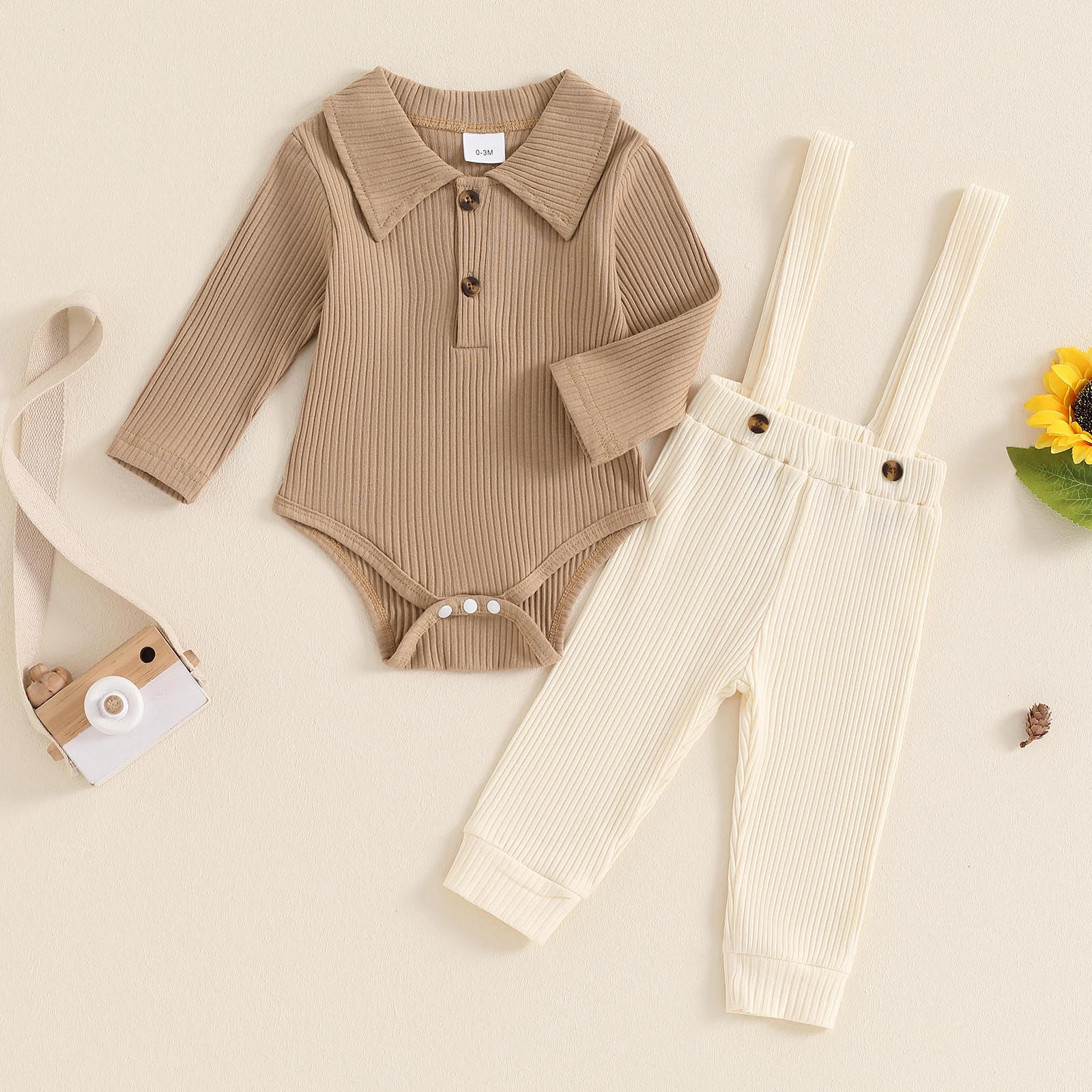Toddler Baby Boys Fall Turn-Down Collar Bodysuits Outfits Casual Long Sleeve Rompers Suspender Knitted Pants Kids Clothes Set