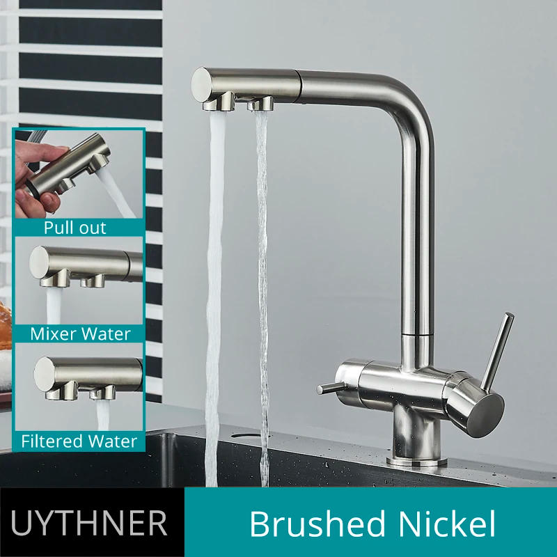 Uythner Waterfilter Kitchen Faucet Dual Handles Deck Mounted Pull Out Mixer Tap 360 Degree Rotation Water Purification Crane