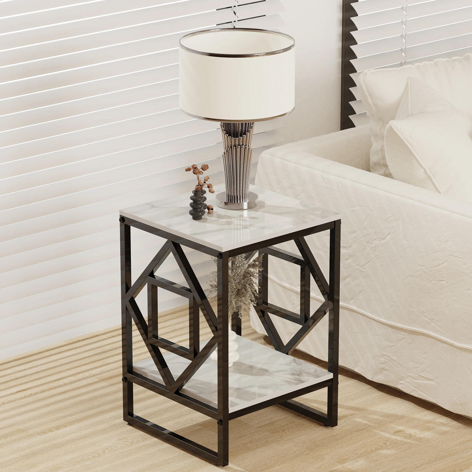 White Marble Top Side Table Sofa End Table Bedside Nightstand Black Coated Frame