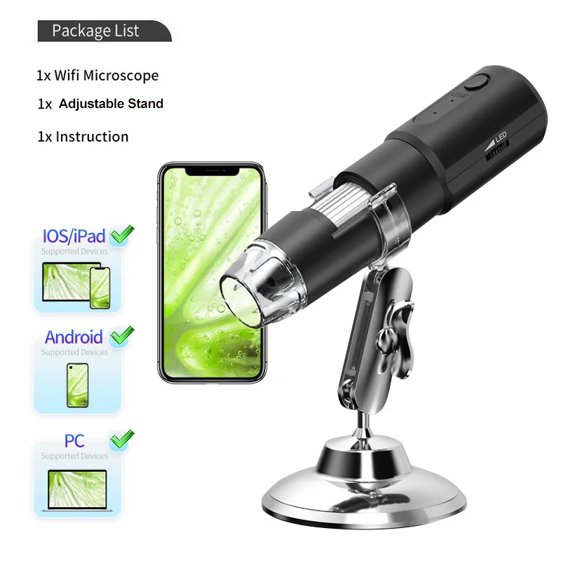 Wireless Digital Microscope 50X-1600X Magnification WiFi Portable Handheld Microscopes with Adjustable Stand For IOS Android PC Main Feature It is an HD digital camera that can take images and listing movies When used, the product can be instantly related to the corresponding interface of the cellular telephone to exhibit photos on the APP It supports 10S instruments and Android instruments with OTG purposes It can be smoothly utilized in different fields Support Take videos and photographs enable us to peer the main points of the microscopic world, and seize and discover the area 50-1600x zoom digital microscope This hand held digital microscope has a magnification vary of 50X-1600X to fulfill maximum of your needs, making it easy to work and focus utilizing the tube focus wheel Check out the incredible particulars Equipped with 8 adjustable LED lighting fixtures These built-in 8 LED lighting present us with a wonderful experience, permitting you to clearly see the small print of the objective object even in a depressing environment How to focus using the focus/magnification dial: The optimum focal size of the microscope is 0-90mm Different object distances correspond to diversified magnifications You should adjust the focus by way of adjusting the focusing wheel to look the thing obviously USB Connection for Computer: 1 For win 10 and 11, you might immediately plug into the USB port and seek CAMERA in WINDOWS in finding it and click on it 2 WIN 7/8, please see the consumer guide 3 For MacBook, please use Macbooks’ bundled utility Photo Booth or Quick Time Player instantly Specification Micro USB/USB/USB-C interface Focusing range: 0-40mm Magnification: 1600X Resolution: 640*480 1920*1080 LED lamp: eight LED Image Format: JPEG Video Format: MP4/AVI Support For Phone, iPad, Samsung Galaxy, Android, Mac, Windows