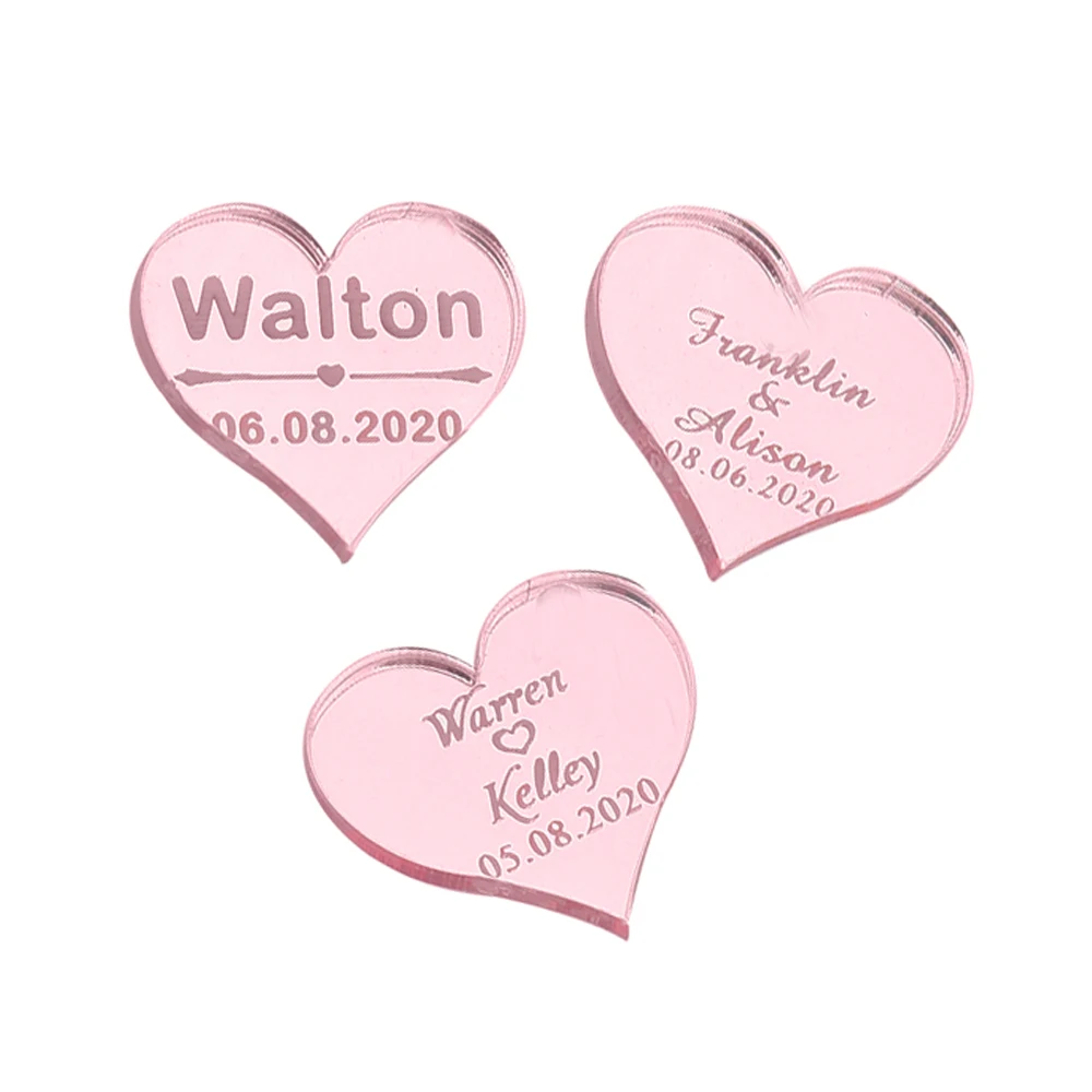 100pcs Personalized Acrylic Mirror Love Hearts Engraved Name Tags Hole Wedding Table Centerpieces Baby Shower Decor Favors