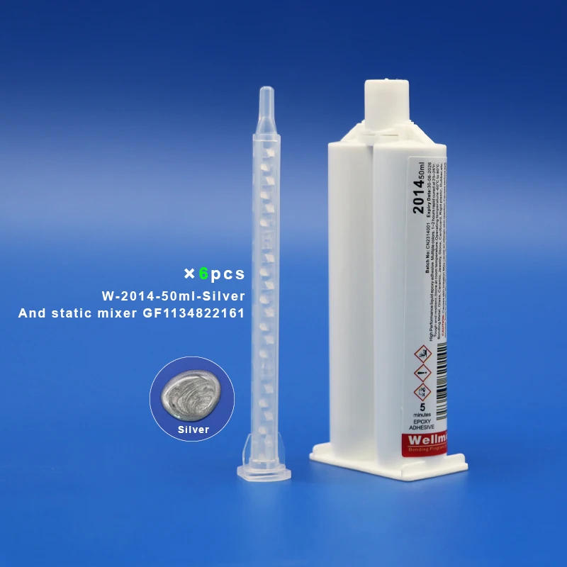 Two Component five Minutes Fast Curing Silver Epoxy AdhesiveWellmid 2014 is a multi-purpose, two-component, room temperature speedy cured semi-fluid viscosity epoxy adhesive,high strength and nice toughness. Can bond maximum materials with Low shrinkage, Good toughness and elasticity. Product code: W-2014-50ML.SINet: 50MLMix ratio by way of volume:100:100Viscosity at 25℃: 25~45 Pa.sState: Semi-fluidWorking time: 4~5 MinutesCured Condition: Room temperatureFull strength: 8 hoursColor after cured: SilverWorking temperature:-60℃-80℃The colour of 2014 AB is Silver after curing. More product Information please read TDS and SDS, Please don't hesitate to contact us.Main applicationsSuitable for bonding metals, ceramics, glass, concrete, wood, some rubbers, inflexible composites and plastics, and most common materials. Applications include bonding and recovery of jewelry and handicrafts, manufacturing and assembly of digital ingredients and industrial components.2014 Silver AB Glue Instead of Epoxy Adhesive ARALDITE 2012 5Minutes Fast Bonded Repair Metal 2Component 50ML Rapid Liquid ResinNote:W2014 cannot be instantly bonded to PE, PP, HDFE, PTFE.If it is best to bond those materials, Please touch us to recommend appropriate glue.Industrial applicationSide-by-side cartridges and the static mixer is acceptable for continual production of the dishing out gun / machine, which can significantly upgrade manufacturing performance and exact dispensing, cut waste and pollution.Storage and PackingThe glue outlet adopts an incorporated molding design, and the tail adopts a totally sealed piston with out porosity to avoid air entry, lower the risk of leakage, and develop the storage life. When utilizing it, spoil off the plug cap together with your hands or a screwdriver. Do now not discard the plug cap. When the glue is not used up, you would plug it into the glue outlet and reseal it for storage.Keep out of reach of kids and don’t swallow.Unopened products must be saved in a dry surroundings at room temperature and away from sunlight.If you need a needle with a thinner outlet, please allow us to know, we can ship it to you together.How to use Just 3 steps.The glue gunProduct code: G50-01-50Application: For 50ml 1:1 or 2:1 cartridge glueIn addition to 50ML ARALDITE 1:1 cartridge glue;Can also be used for 3M, Loctite, Devcon, Delo, Lord, Permabond manufacturers comparable to 50ml 1:1 cartridge glue.There is a slight deviation within the dimension size, if you are unsure whether or not it is appropriate to your existing glue, please contact us.ODM FOR YOUThe natural color of 2014 is yellow after curing. And we will ODM for you more colors, you could favor the appropriate colour according to the use requirements. Black, Brown, Grey, Silver are produced normally, please seek advice from the product line for details.Choose the colour you want.W2014 has diverse specifications. It can meet the quantity of family use, industrial use and the quantity that's handy for you to test. You can prefer the suitable specification in line with the use requirements.Cartridge packing: 25Grams / 50ml / 200ml / 600ml Cartridge.Tin can packing: 2oz(56.7Grams) / 2lb(908Grams) / 2kg Tin can sets.Choose the kit that you want.25G PackagingConvenience of your production assembly Test and Household use and One-time bonding.50ml/200ml/600ml Cartridges packagingFor continual manufacturing of the meting out gun/machine, Precise meting out and upgrade production efficiency.2LB and 2KG tin can packagingSuitable for hand-applied glue and Large subject glue application.