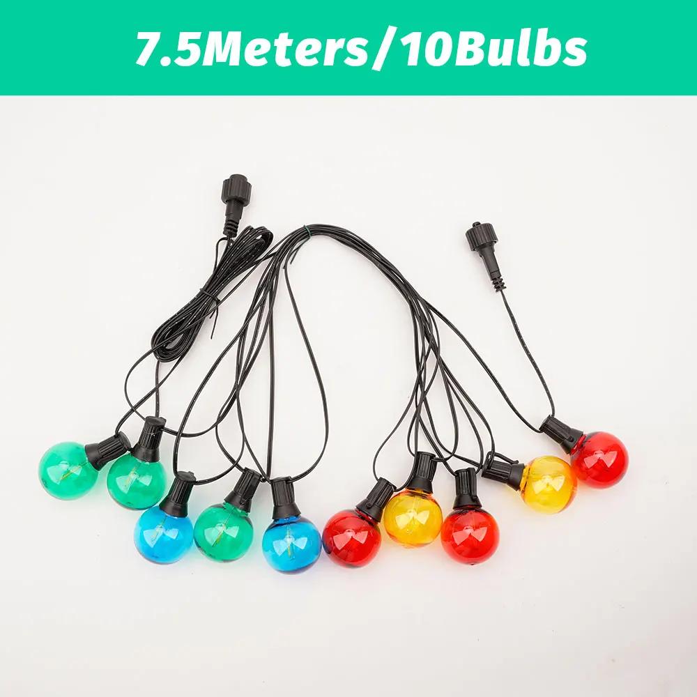 21Meters G40 BulbS Street String Light Garland Shatterproof Globe Light Outdoor Patio Decoration Wedding Party Cafe Lighting LED **Total length: 7 ( 3M plug cable + 4Meters with 10 Bulbs) 12Meters ( 3M plug cable + 9Meters with 20 Bulbs) 21Meters ( 3M plug cable + 18Meters with 40 Bulbs)Specification: ** The Bulb Size: 4cm ** Bulb Quantity : 10/20/40 LED Bulbs **The size from the plug to the 1st bulb: 3 meters **Connectable : Yes , You can connect 3pcs string light fixtures together **Lighting color: Warm white **The sapcing between bulbs :45CM **Wattage: 9 Wattage **The color of the cover: RGB ** Material of Globe : Plastic **Occasion : for indoor / outdoors use either , Wedding , Party Holiday Garden Decoration. ** Wire Color : Black **Waterproof: YES(IP44)